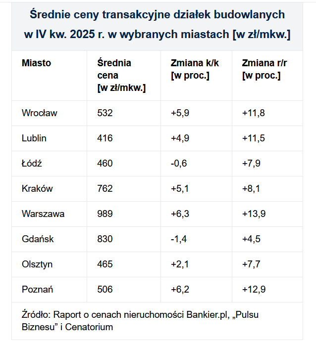 Względem IV kw. 2024 r., gdy notowaliśmy spadki, średnia cena transakcyjna podniosła się o blisko 14 proc. W dwucyfrowym tempie parcele podrożały w aktach notarialnych także w Poznaniu, Wrocławiu i Lublinie.