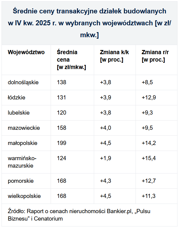 Nie tylko rosnący, ale i przyspieszający wzrost kwot płaconych za działki budowlane zanotowano w mniejszych miejscowościach. Jedynie w woj. warmińsko-mazurskim średnia cena transakcyjna podniosła się względem III kw. 2025 r. o mniej niż 2 proc. W pozostałych analizowanych województwach grunty budowlane podrożały od blisko 3 do 4,5 proc. k/k.