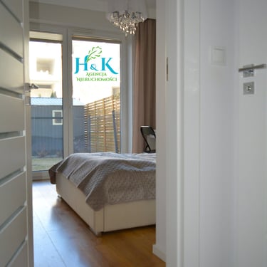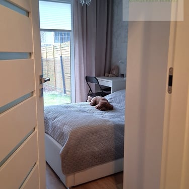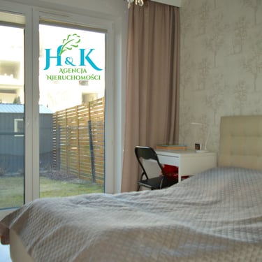 Sypialnia znajduje się w części mieszkania oddalonej od drogi osiedlowej, a ogródek od tej strony graniczy z ogrodem sąsiadów, co zapewnia ciszę, prywatność i większy dystans od sąsiedniego budynku.