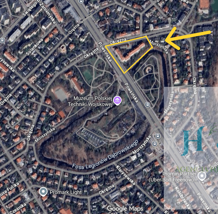 Budynek położony jest nad dawną fosą fortu na Sadybie. Teren ogrodzony z własnym parkiem – idealne miejsce na spacery. Dodatkowym atutem jest park im. Czesława Szczubełka (z wyodrębnionym placem zabaw) po drugiej stronie fosy oraz Park Sadyba (z boiskiem do gry w piłkę nożną) po przeciwnej stronie ul. Powsińskiej. W bezpośrednim sąsiedztwie jest szkoła, Muzeum Polskiej Techniki Wojskowej oraz centrum handlowe Sadyba Best Mall. Przy posesji usytuowane są przystanki autobusowe – dobry dojazd do centrum miasta.
